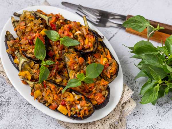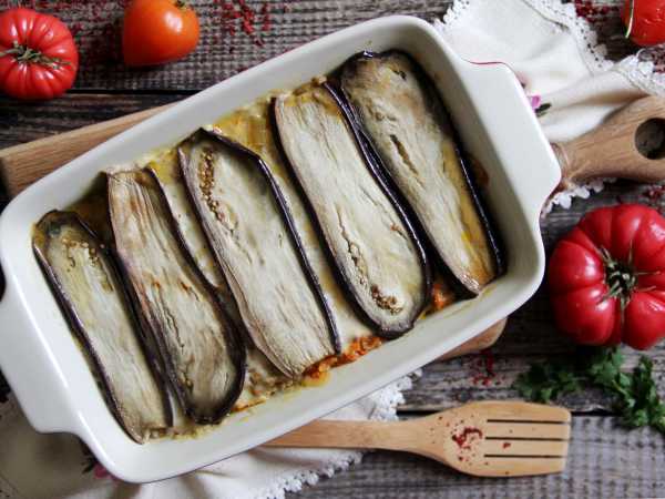 Перекладываем подготовленные баклажаны на противень, застеленный бумагой для выпечки, или в форму для запекания.