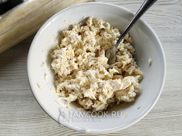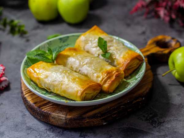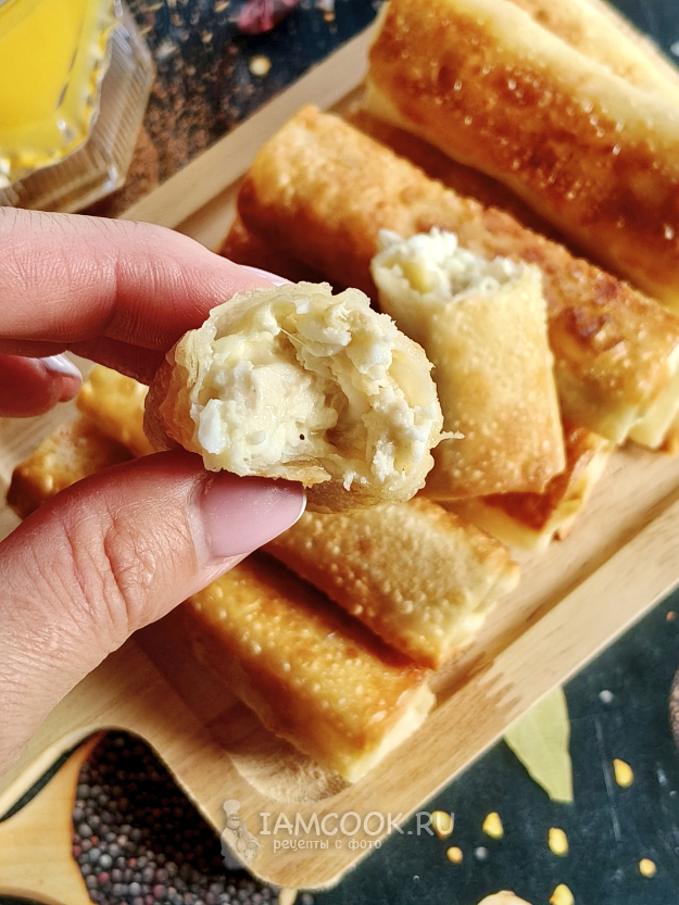 Хрустящие жареные трубочки из теста фило с нежной начинкой из курицы, сыра и яйца. Можно подать в качестве перекуса или как закуску к любым напиткам.