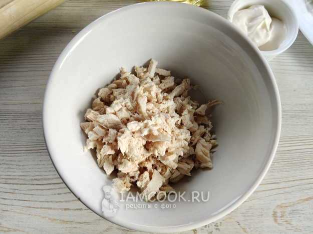 Курицу отварить до готовности в подсоленной воде. Яйца сварить в течение 12 минут, залить холодной водой, а как остынут - почистить.