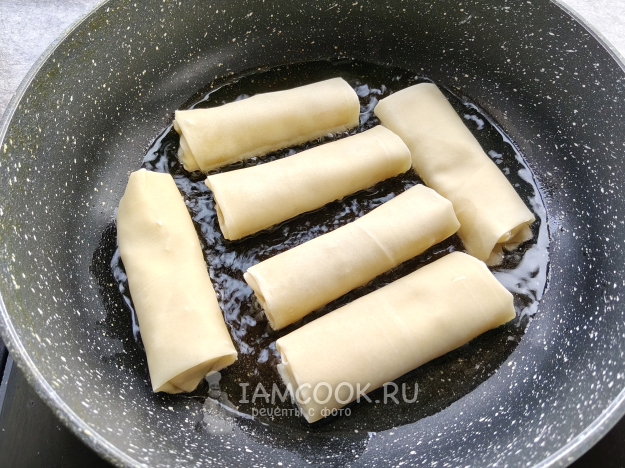 Жарить трубочки в горячем масле до румяного состояния со всех сторон.