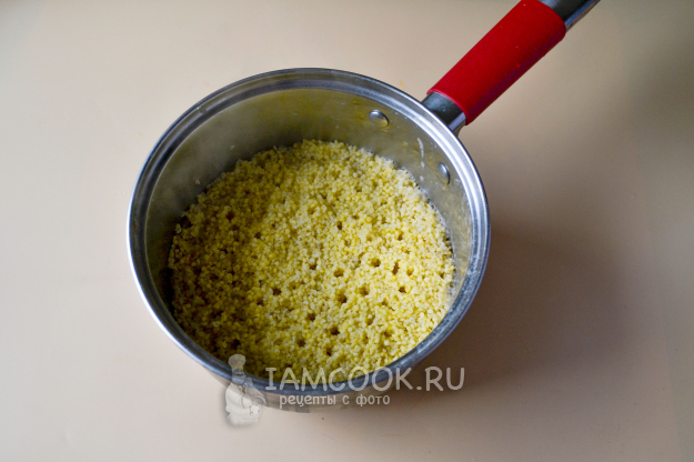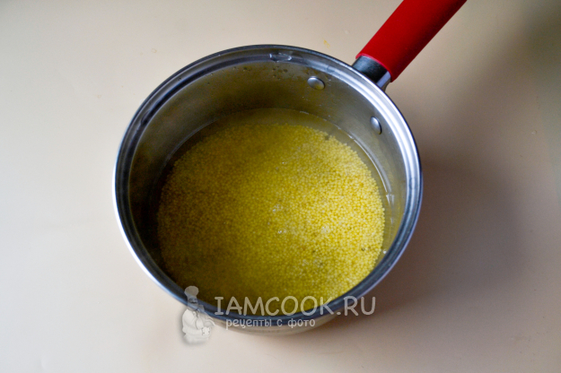 Затем залейте пшено кипящей водой и оставьте на 8-10 минут. После чего это воду слейте, залейте горячей водой, посолите и поставьте сотейник на огонь.