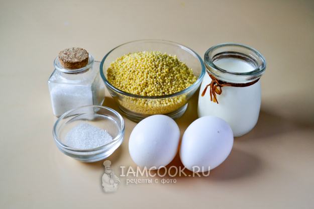 Соберите продукты для приготовления пшенной каши с яйцом в духовке. Пшено тщательно промойте холодной водой, меняя ее несколько раз.