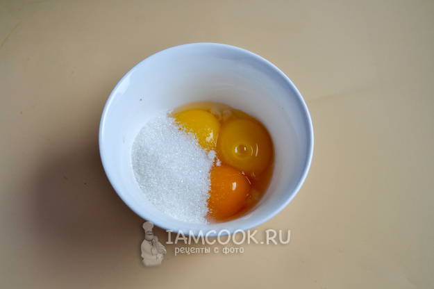 Яйца вымойте, обсушите, разделите на белки и желтки. К желткам добавьте сахар по вкусу. Если яйца крупные, то будет достаточно 2 штук.