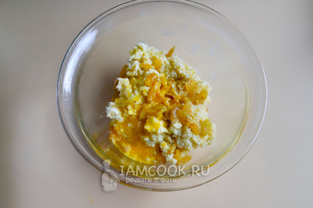 В теплую пшенную кашу влейте желтки с сахаром. Я добавила немного промытого изюма. Можно и без него сделать либо положить другие сухофрукты или не крупно нарезанные фрукты.