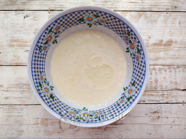 Влить масло, перемешать снова. Оставить миску с тестом на 10 минут на столе, чтобы масса немного загустела за счет набухания муки в жидкости.