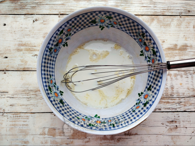 Венчиком смешать компоненты, чтобы сыпучие полностью растворись, я белок яйца разошелся. Влить молоко, размешать.