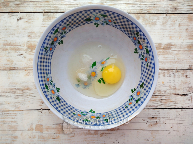В глубокую посуду вбить яйцо, добавить сахар, соль.