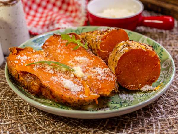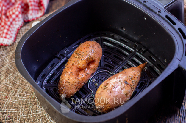 Переложите в чашу аэрогриля и запекайте 30 минут при температуре 180 градусов. Важно! Время приготовления будет зависеть от размера овоща и особенностей вашей техники. Всегда можно открыть чашу и проткнуть батат ножом: если он свободно входит в середину овоща, значит он готов.