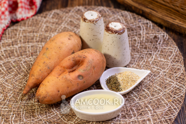 Соберите необходимые продукты для приготовления батата в аэрогриле целиком. Возьмите не очень крупные клубни батата: чем меньше плод, тем меньше времени на запекание. Я взяла два батата весом по 250 граммов каждый. Также, чтобы овощ получился вкусным и ароматным, добавила к нему немного сушеных специй и масло.