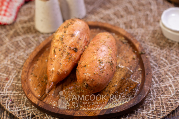 Батат посыпьте сухими специями, солью и черным молотым перцем.