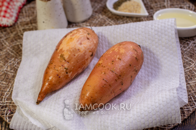 Батат хорошо помойте при помощи щетки. А затем тщательно обсушите бумажным полотенцем.