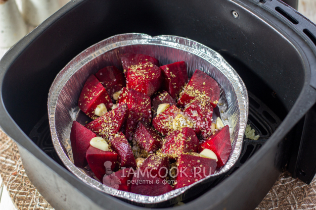 Посыпьте сушеным орегано, солью и черным молотым перцем. Полейте маслом. Установите форму со свеклой в чашу аэрогриля и запекайте 20-30 минут при температуре 180 градусов. Время приготовления кусочков свеклы в аэрогриле будет зависеть от размера нарезки.