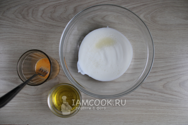 Для дрожжевого теста на топлёном масле подготовьте ингредиенты по списку к рецепту. Обратите внимание на способ использования сухих дрожжей, он указан на упаковке (в муку или в жидкие ингредиенты). Точное количество муки зависит от густоты кефира и размеров яйца.