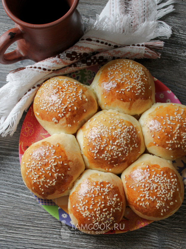 В этот раз были простые круглые булочки, посыпанные кунжутом. Пышные и ароматные.