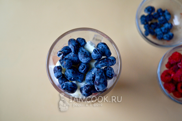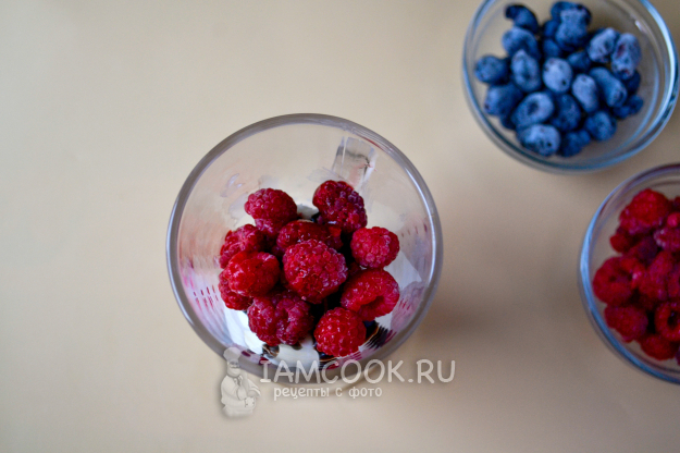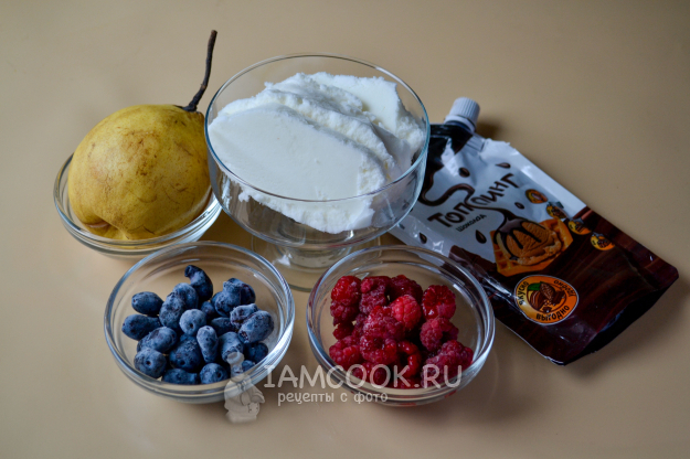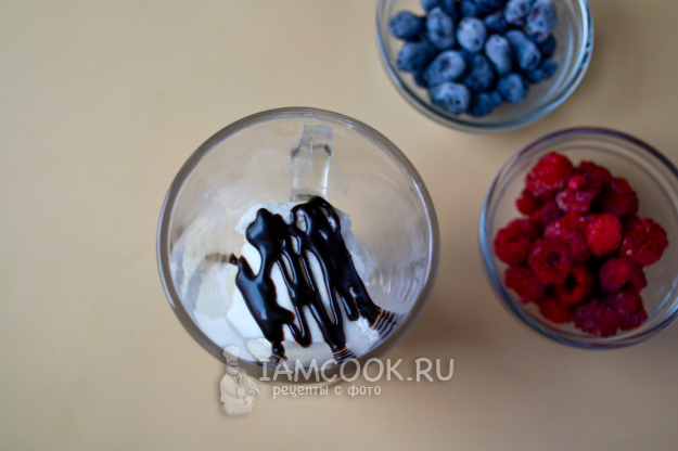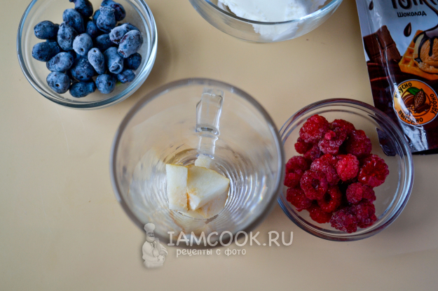 Соберите продукты для приготовления десерта-мороженого «Сандей» («Сандэй»). Я буду использовать малину и жимолость, а также грушу и шоколадный топинг.