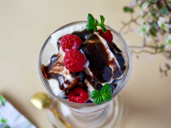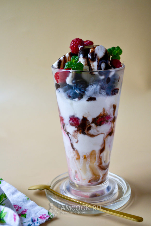 Украсьте листочками мяты, ягодами и сразу подавайте десерт-мороженое «Сандей» к столу.