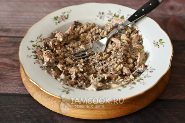 На картофель выложите размятую консервированную иваси и разровняйте. Майонезом не смазываем, она и так сочная.