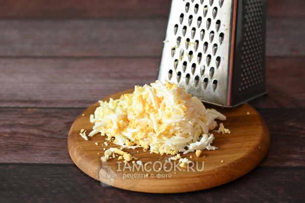 Яйца также натрите на крупной тёрке или мелко порубите ножом.