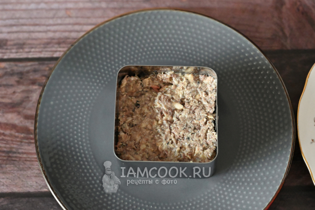 Начинаем сборку салата с консервированной иваси, делать будем слоями через кулинарную формочку.