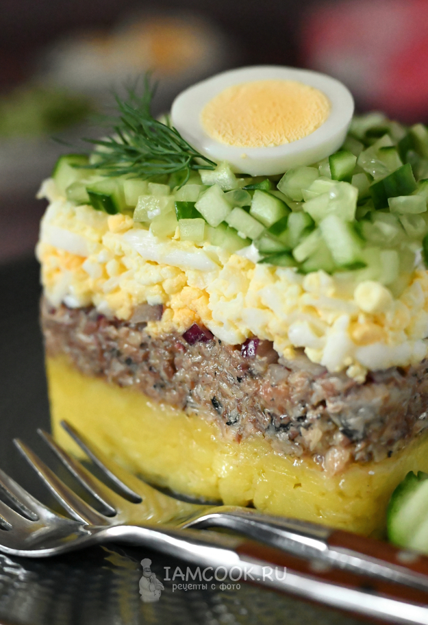 Салат с консервированной иваси готов! Нужно аккуратно снять формочку и дать салату пропитаться в холодильнике часок-другой. После чего можно украсить на свой вкус и подавать к столу.