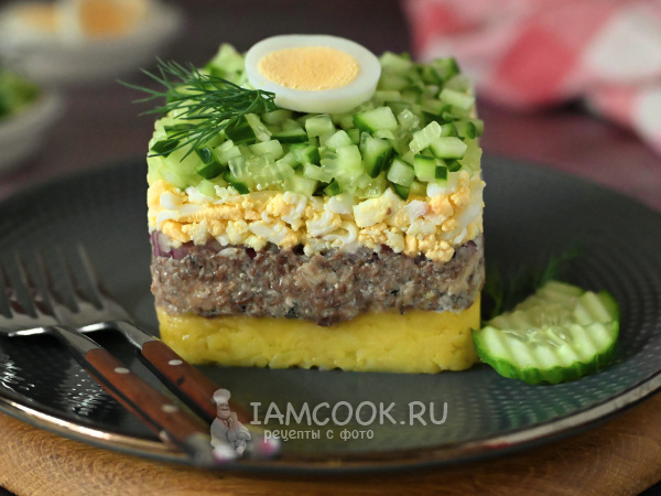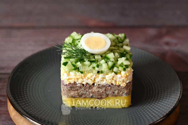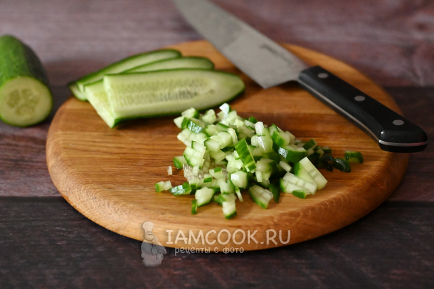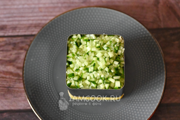 Самым верхним слоем выкладываем кубики огурца. Огурец не солим и не смазываем майонезом, чтобы он не потёк.