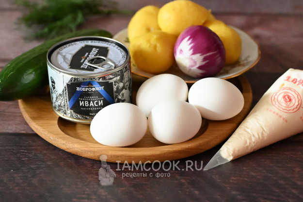 Соберите все необходимые продукты для приготовления слоеного салата с консервированной иваси.