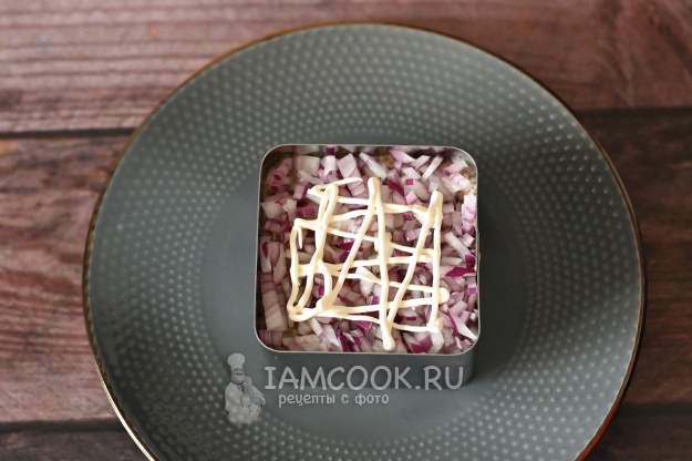 На иваси выложите нарезанный лук и опять сеточку майонеза.