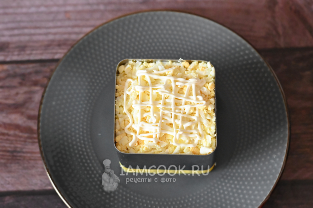 Поверх лука кладём натёртые яйца, можно также слегка подсолить их. На слой яиц наносим сеточку майонеза.