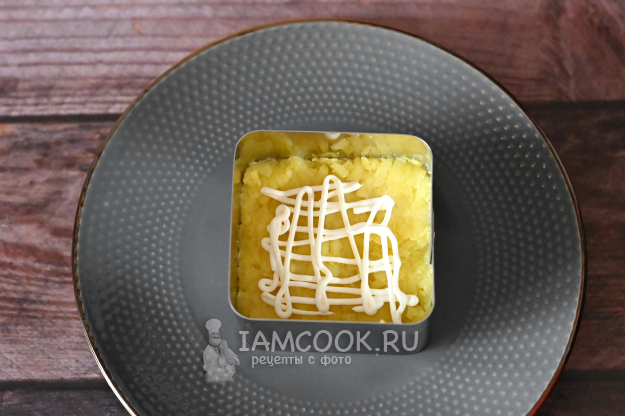 Нижним слоем выложите натёртый картофель, примните его ложкой и сделайте сеточку майонеза. Можно чуток подсолить этот слой.
