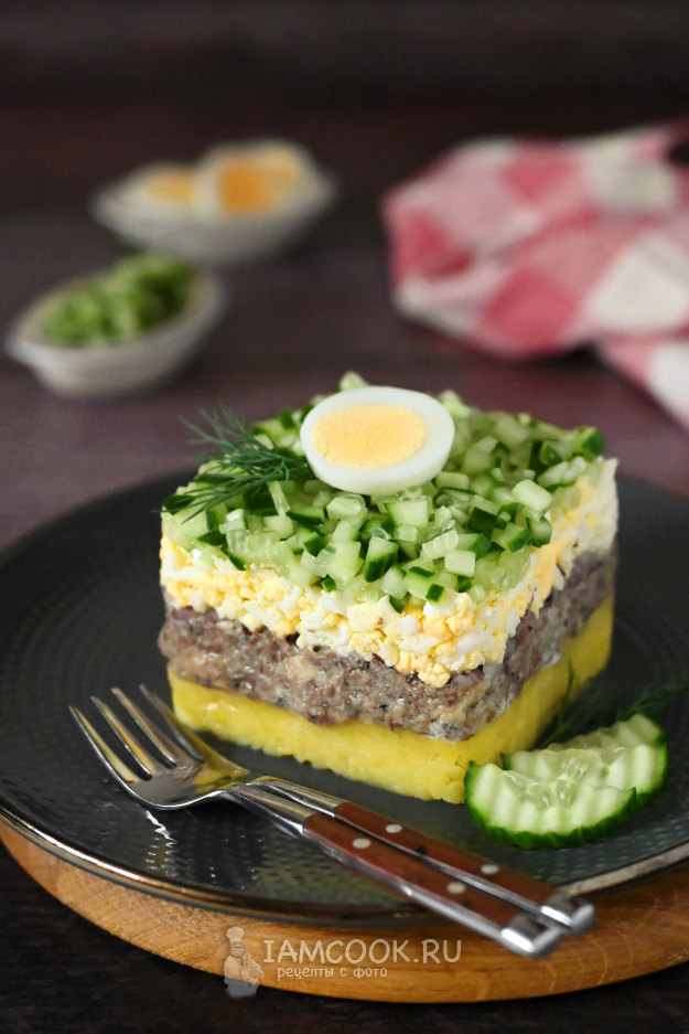 Если нет кулинарной формочки, то салат можно собрать слоями и в салатнике, будет смотреться ничуть не хуже.