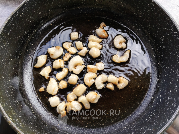 Шумовкой переложить галушки в сковороду с салом. Прогреть.