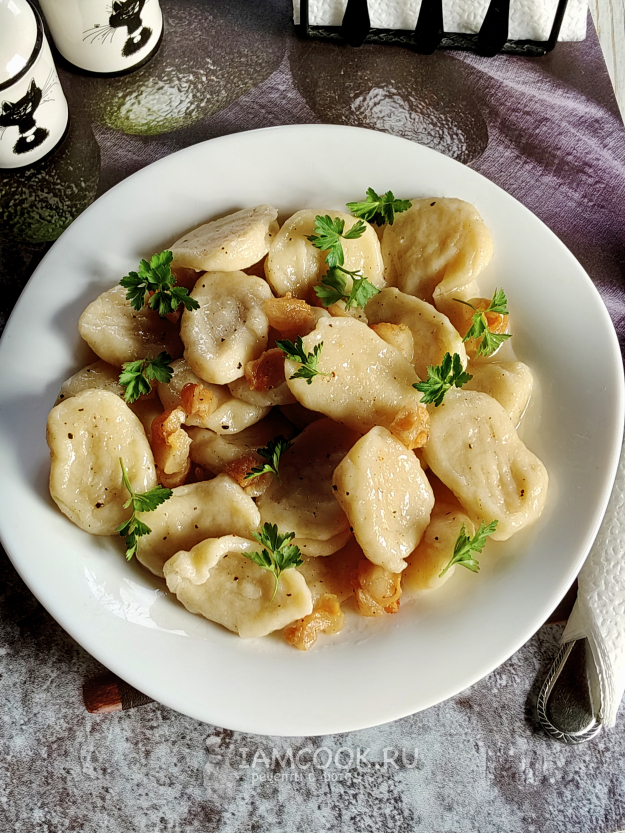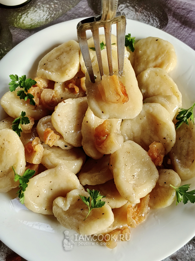 Приготовим мягкие галушки на тесте с яйцом и сметаной, а дополним их жареным салом. Это очень калорийно, но безумно вкусно! Можно добавить в сало лук, но это будет уже совсем другая история.
