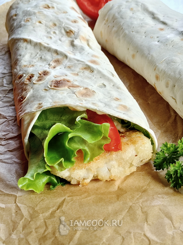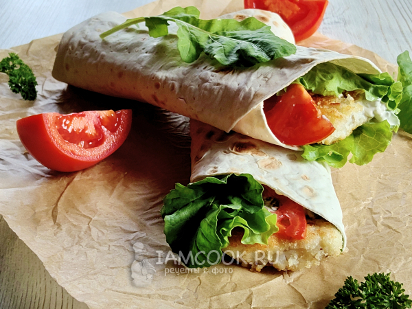 На лаваш выложить несколько листьев салата, рыбу, соус и дольки помидора.
