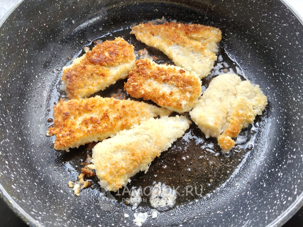 Затем обмакнуть рыбу во взбитое яйцо и запанировать в сухарях.