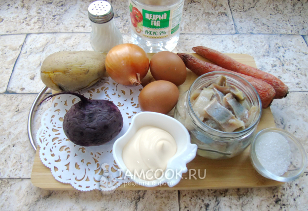 Соберите ингредиенты для приготовления селедки под шубой с маринованным луком.