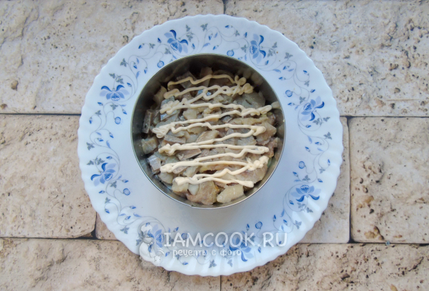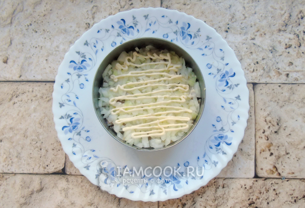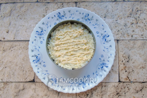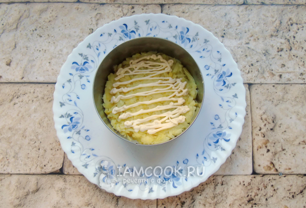 Картошку отварите в кожуре, охладите и очистите. Затем натрите на терке и выложите первым слоем салата. Покройте сеточкой майонеза.