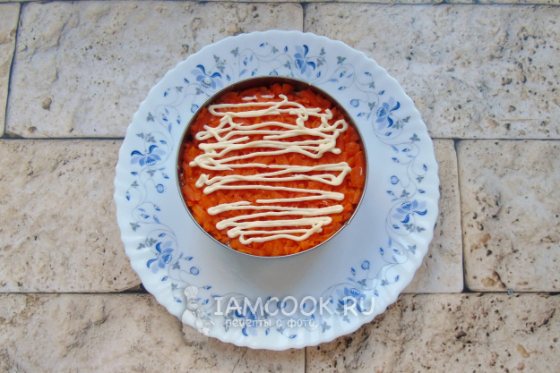 Морковь сварите, охладите, очистите и натрите на терке. Выложите на слой яиц.