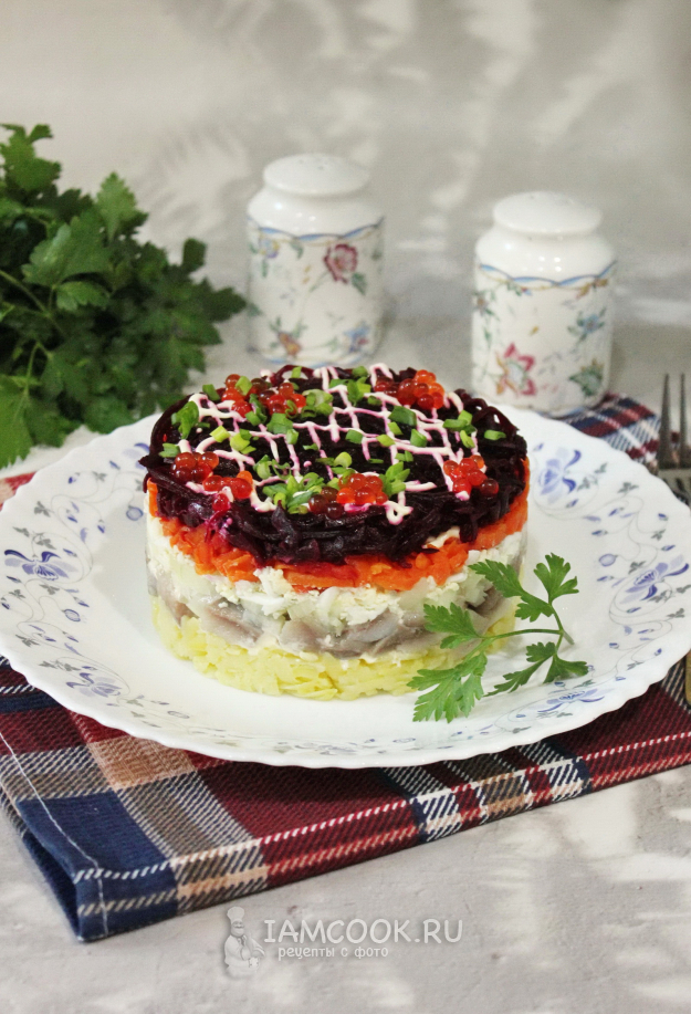 Селедка под шубой с маринованным луком готова. Верх салата покройте сеточкой майонеза, украсьте по вкусу. Снимите салатное кольцо и подавайте к столу.