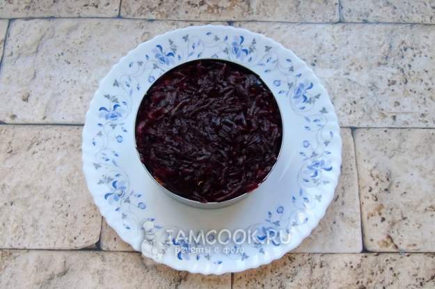 Свеклу отварите до готовности, охладите и очистите. Натрите на терке. Выложите последний слой салата.