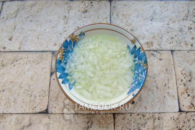 Репчатый лук очистите, помойте и мелко нарежьте. Выложите в мисочку и залейте водой. Добавьте соль, сахар и уксус. Маринуйте 15 минут. После маринад слейте.