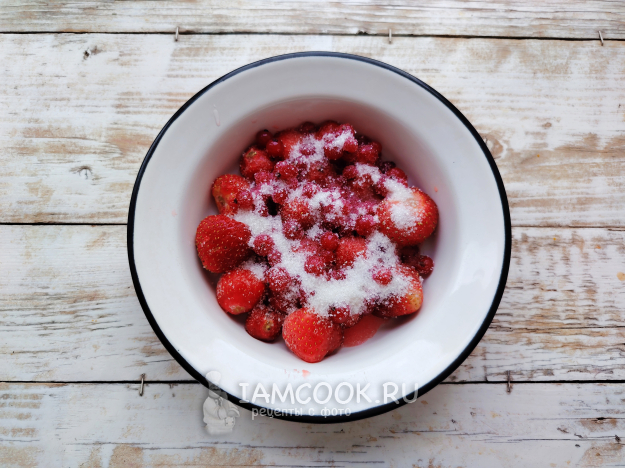 Ягоды промыть, удалить чашелистики, кисточки. Поместить в огнеупорную посуду, засыпать сахаром, оставить на пару часов на столе, чтобы ягоды пустили сок.
