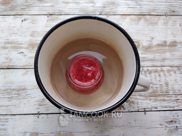 Разложить заготовку по стерильным баночкам. Банки поместить в кастрюлю с водой, поставить на плиту. Стерилизовать варенье в баночках объемом до 0,5 л на водяной бане в течение 10 минут. Закатать банки крышками, обернуть полотенцем, чтобы остывание варенья происходило постепенно. Убрать джем из клубники и красной смородины на хранение в прохладное место.