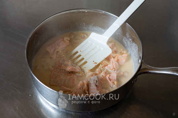После этого снять сковороду с огня и энергично вмешать в соус желток. Вернуть сковороду на слабый огонь и довести соус до загущения, хорошо промешивая.