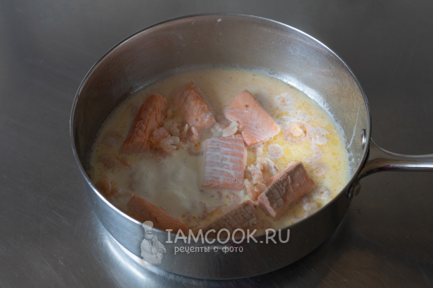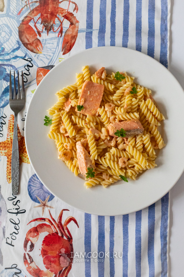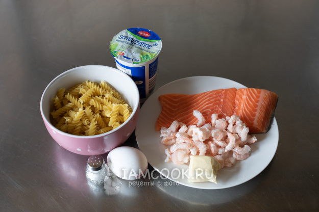 Соберём ингредиенты по списку для приготовления пасты с лососем и креветками.
