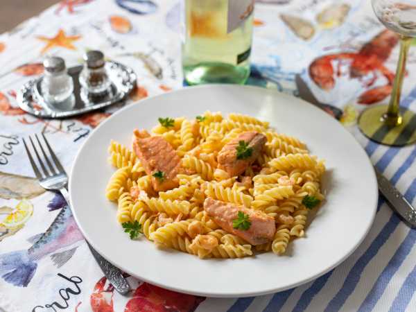 Пасту с лососем и креветками можно декорировать петрушкой.