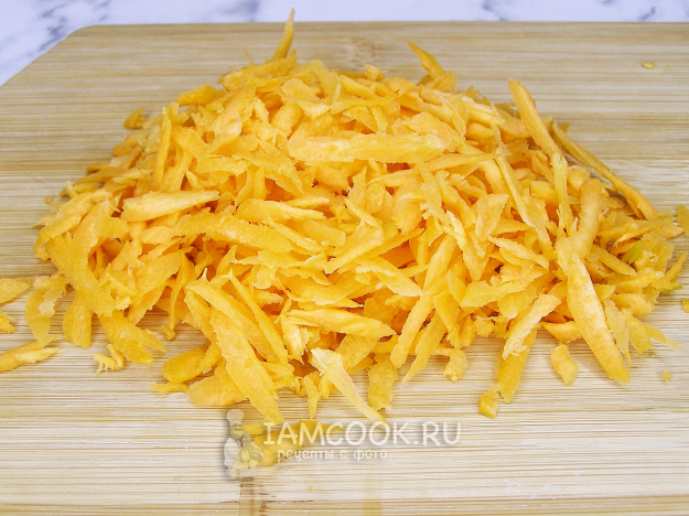 Очищенную морковь натираем на крупной тёрке или на тёрке для корейской моркови.