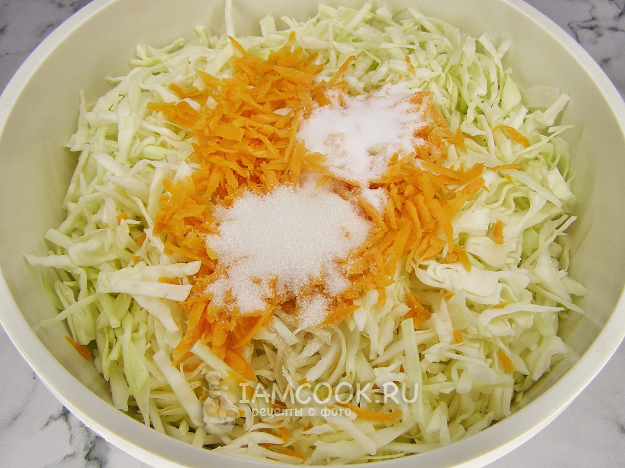Перекладываем нарезанную капусту и натёртую морковь в глубокую миску, добавляем соль и сахар. Перемешиваем руками, сжимая и разминая капусту, пока не появится сок. Так она получится более сочной и мягкой. Если любите более хрустящую капусту, то положите её вместе с морковью, сахаром и солью сразу в пакеты и размешайте всё прямо в них.