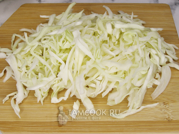 С капусты удаляем повреждённые листья, вырезаем кочерыжку. Тонко шинкуем капусту. Можно нарезать её ножом, а можно воспользоваться специальной шинковкой. В нарезанном виде должен получиться 1 килограмм.