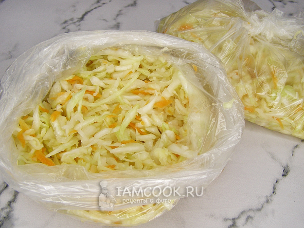 Раскладываем капусту по пакетам, завязываем их на узел и убираем в холодильник. Периодически (примерно через каждые 6-8 часов) пакеты нужно переворачивать, чтобы сок равномерно распределился по капусте.