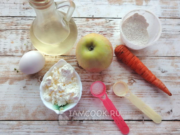 Собрать по списку продукты для сырников с морковью и яблоком. Творог можно использовать более жирный. Еще лучше, если получится приобрести натуральный деревенский продукт, чтобы блюдо получилось еще питательнее и вкуснее.